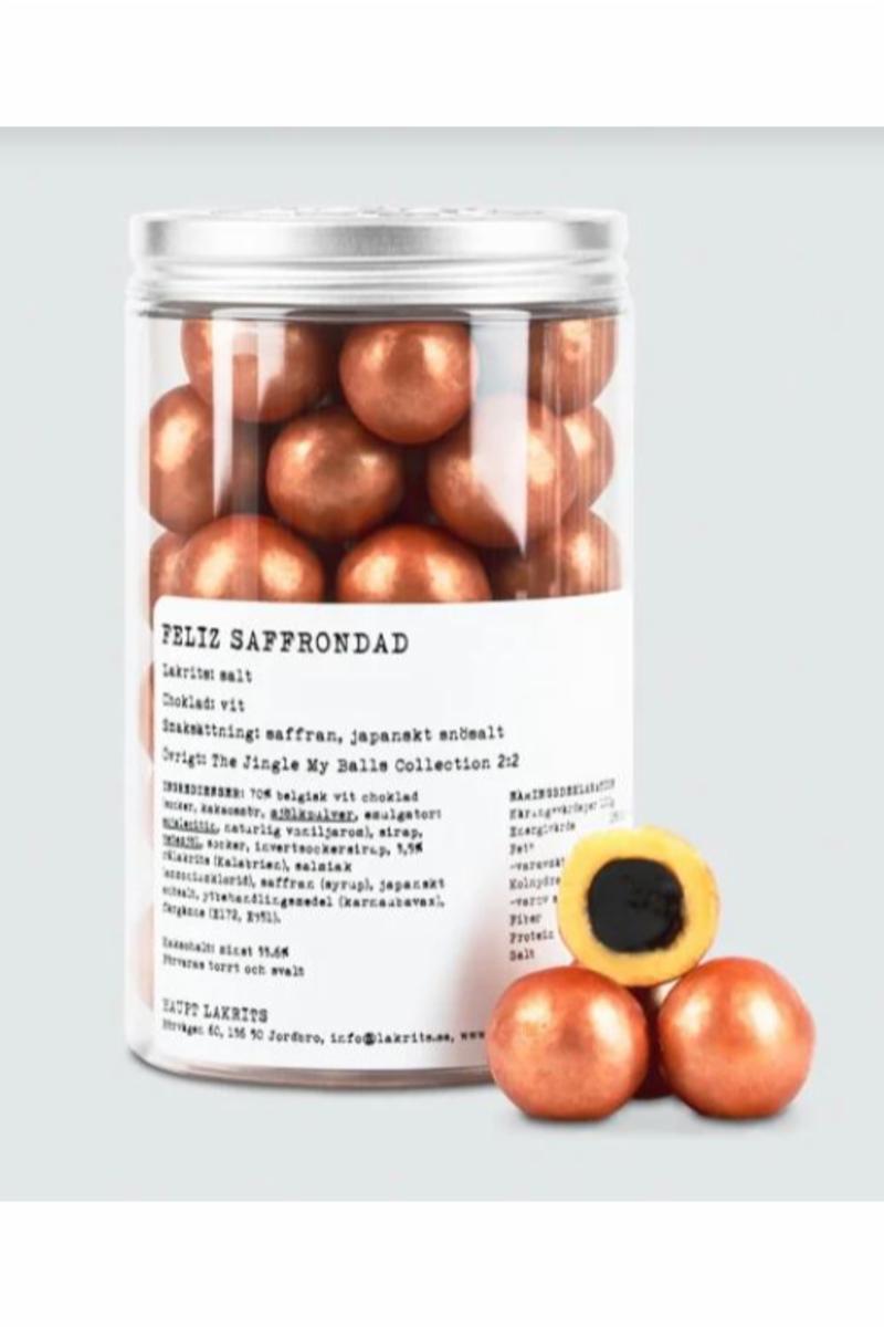 Salt lakris dekket av hvit sjokolade smaksatt med safran og japansk snøsalt