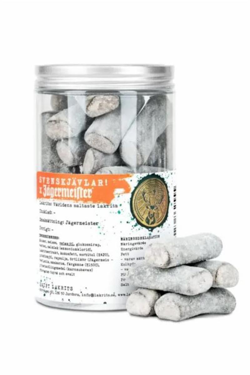 Svenskjävlar! smaksatt med Jägermeister tar godtegrisen på en intens smakreise. Den ikoniske salte lakrisen møter Jägermeisters komplekse urtesødme og krydder.