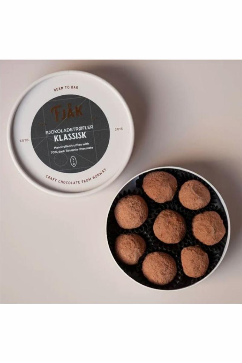 En fin eske med klassiske håndlagede trøfler, laget med deilig mørk sjokolade.