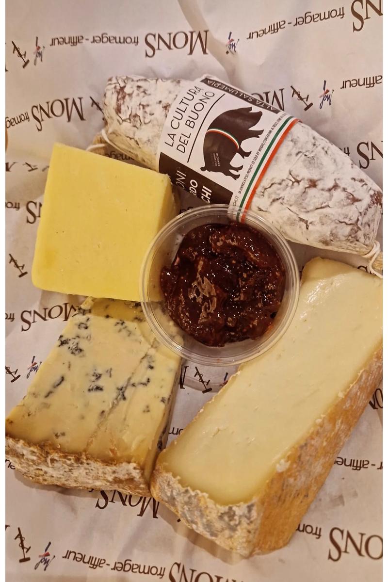 Pakken inneholder Taleggio, Kerrygold cheddar og Stilton (ca. 150 gr. pr ost) samt en pølse med trøffelsalami og et glass fikensyltetøy.