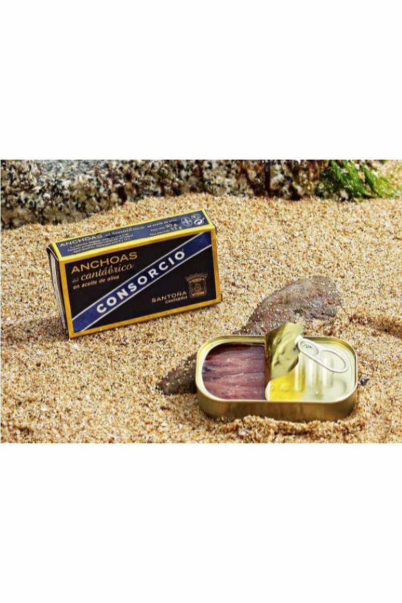 Små cantabriaansjos av toppsortering konservert med EVO. Ansjosfiletene er saltet og modnet i tønner med saltet i 6 måneder før de fileteres og legges i boksen for hånd.